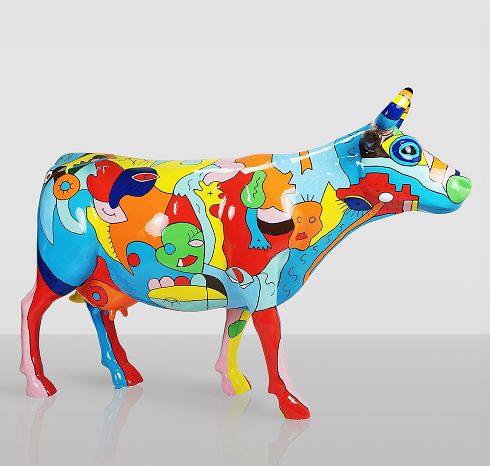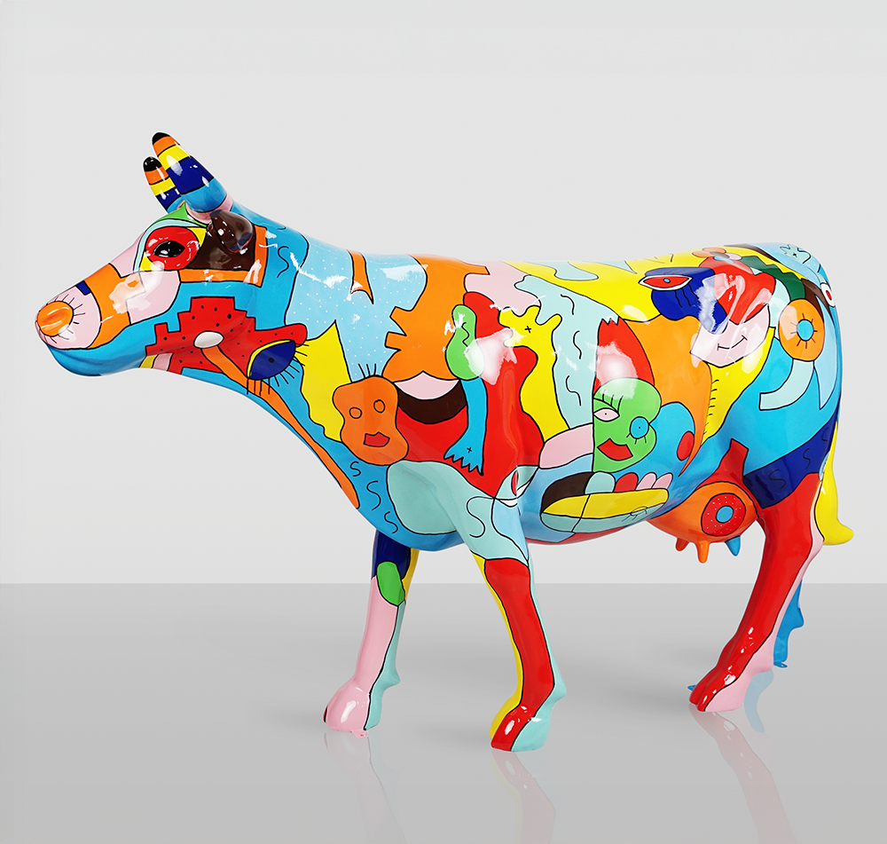 Każdy egzemplarz jest ręcznie malowany, co czyni go jedynym w swoim rodzaju dziełem sztuki. Krowa wyróżnia się bogatą paletą barw i abstrakcyjnymi wzorami, które mogą przypominać dzieła Picassa – pełne ekspresji i kolorów, idealnie komponują się z nowoczesnymi jak i bardziej tradycyjnymi przestrzeniami.