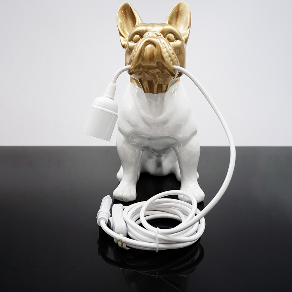 Biała figurka dekoracyjna ze złotą głową – pies bulldog francuski lampa z białym kablem.