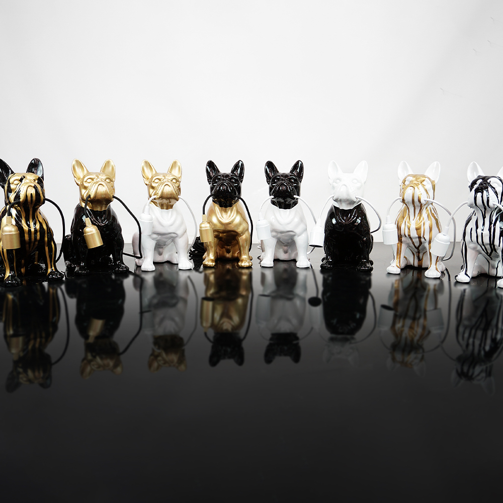 Biała figurka dekoracyjna złoty trash – pies bulldog francuski lampa z białym kablem.