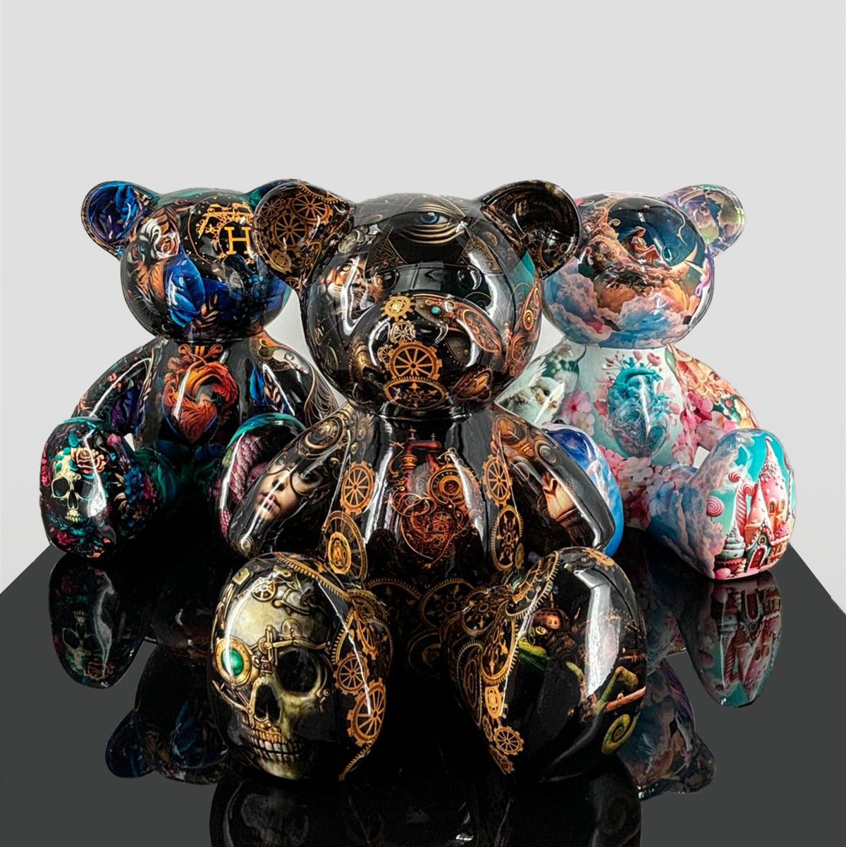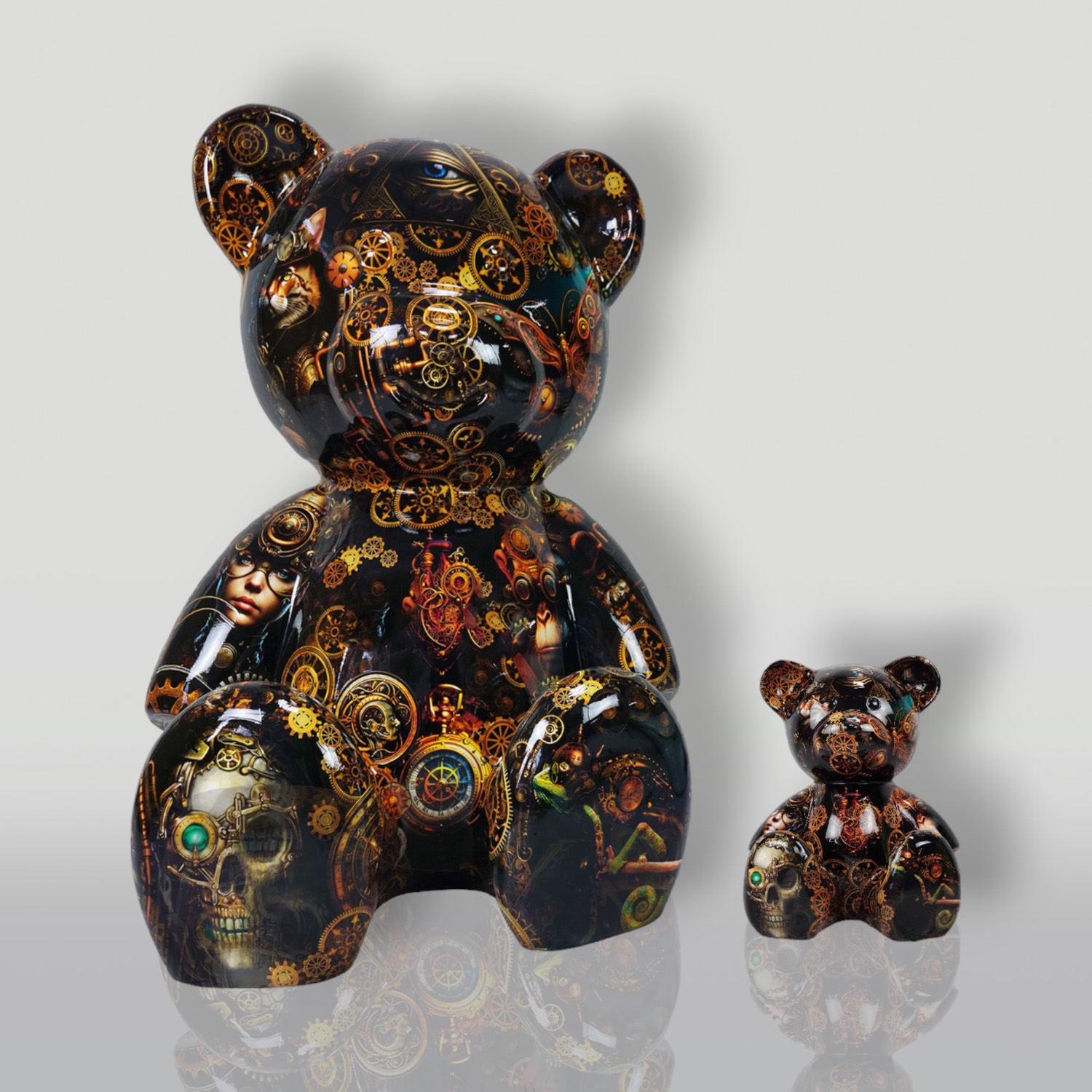 Figura małego misia siedzącego wykonanego techniką oklejania folią w motywie industrialnym