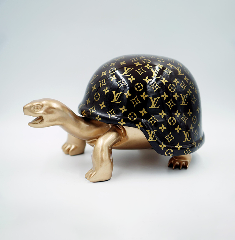 Figura 3D – Żółw w kasku ze złotym monogramem L doskonale sprawdzi się jako element wystrój wnętrz, dekoracji biurowej, galerii sztuki czy eventu. Może być również wykorzystana jako oryginalna forma reklamy zewnętrznej i wewnętrznej, przyciągając uwagę potencjalnych klientów.