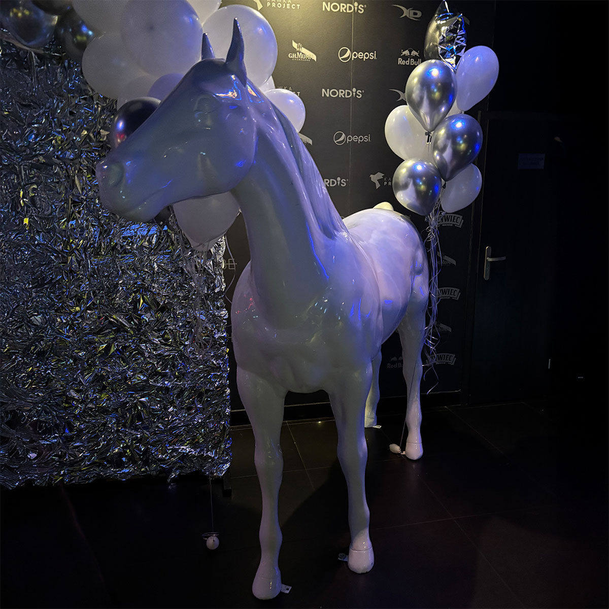Całość pokryta została wysokopołyskowym lakierem w odcieniu czystej bieli, co doskonale wpisało się w monochromatyczną scenografię eventu. Anatomia konia odwzorowana została w realistyczny sposób – z dbałością o proporcje i detale anatomiczne, co podkreśla efekt premium całej kompozycji.